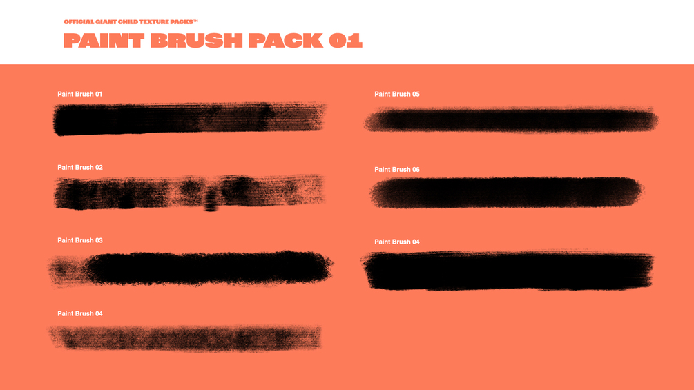 You get all three Giant Child Texture Packs - Paint Brush Pack 01, Frame Loops 01, and Paint Matte Pack 01- at a discount. You’ll receive: